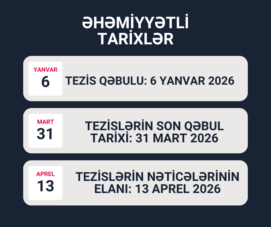 Azərbaycanın inkişaf edən laborator tibb sahəsinə töhfə vermək yolunda birlikdə böyük nailiyyətlər əldə edirik. Bu Konqresdə də Biokimya, Mikrobiologiya, İmmunologiya, Patologiya, Genetika sahələrini əhatə edən, bir-birindən maraqlı simpozium, panel məruzələr və konfranslar yer alacaqdır. Konqres iştirakçıları üçün maraqlı sosial proqramların təşkil olunması da nəzərdə tutulur. Sizi AZLTK & LAB EXPO 2026 çərçivəsində keçiriləcək bütün elmi və sosial tədbirlərdə fəal iştirak etməyə dəvət edirik. Konqreslə bağlı yenilənmiş məlumatlar www.azltk2026.org saytında və AZKLMİB-in sosial media hesablarında paylaşılacaq. Hörmətlə,